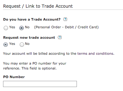 If available in your region and your account allows for credit/debit card purchases, you may select that option. Otherwise select one of the available invoicing methods. Please see the terms and conditions for opening a trade account for the first time.