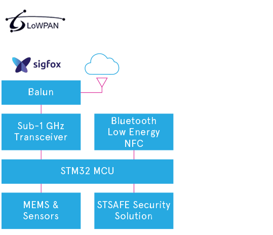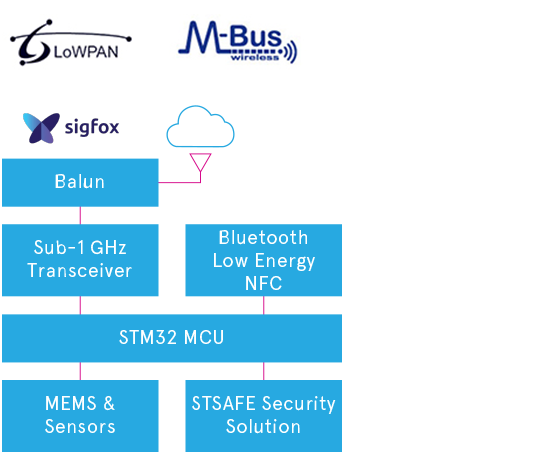 A standard-compliant wireless technology, optimized to fit long range connectivity, power efficiency and bandwidth requirements, is behind every network - regardless of its nature or purpose. With the growing importance of wireless sensor networks and the IoT, most electronic systems require wireless connectivity. ST’s portfolio includes a variety of RF transceivers, wireless microcontrollers, network processors ICs and fully certified modules for key wireless connectivity technologies including Sub-1GHz, LoRaWAN, Sigfox, Wireless M-Bus (wM-Bus), LTE Cat 1 and Narrowband IoT (NB-IoT), WiSUN and 6LowPAN
